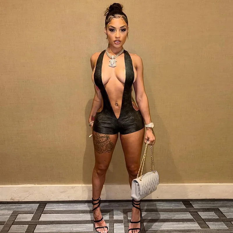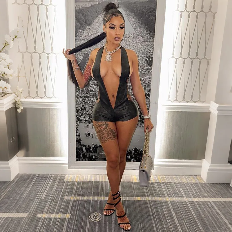 C0199 Summer Sexy Deep V Backless Hanging Neck Solid Color Bodycon Jumpsuit Women's Clothing